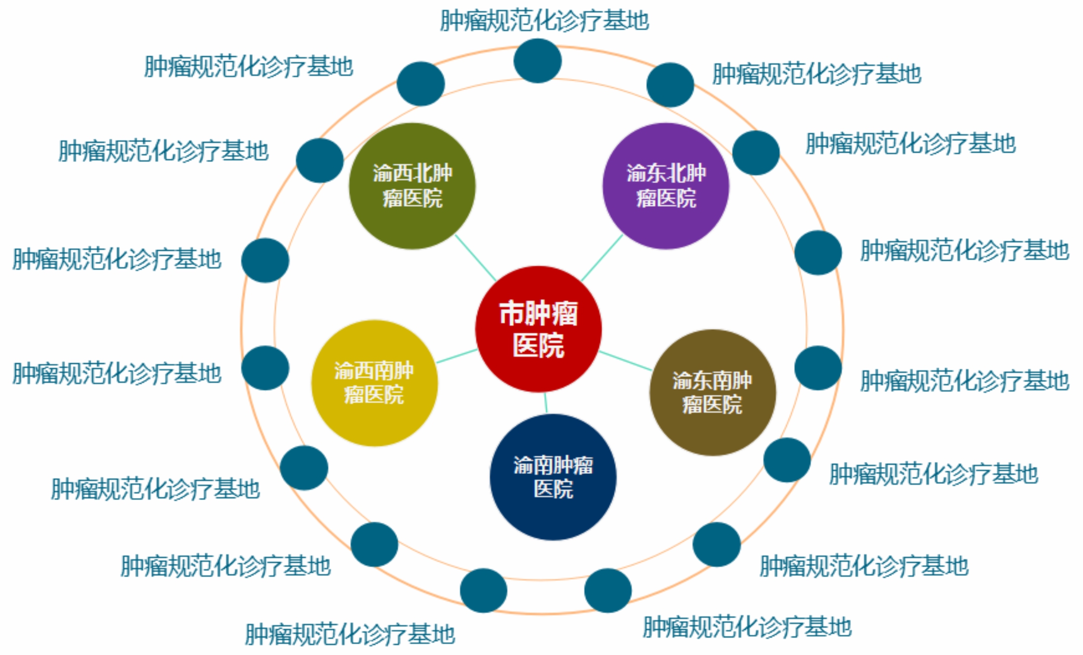 近年来,医院创新性提出“一网一链”肿瘤防治体系的战略构想。在重庆及周边地区构建以重庆市肿瘤医院为核心,二级医院为枢纽,基层医疗机构为重点的相互协作、上下联动的肿瘤防治体系,建立肿瘤防控“横到边,纵到底”的立体防线;形成涵盖科普宣传、早期筛查、规范诊疗、康复管理的完整肿瘤诊疗服务链,推行肿瘤全过程管理模式及理念,制定统一的全过程管理规范与路径,实现网络单位同质化服务。目前已经建成5家分院、21家肿瘤规范化诊疗基地、79家技术指导医院。